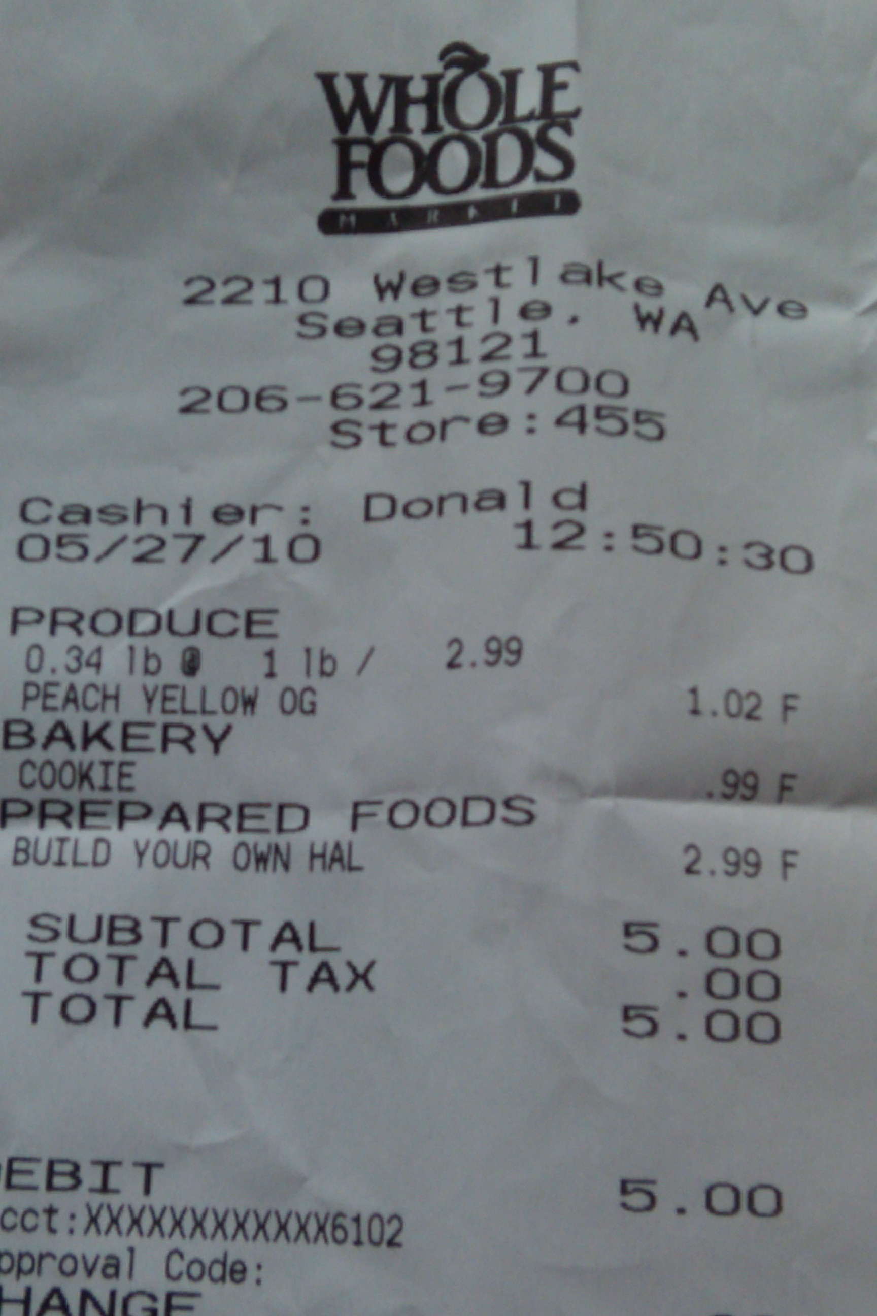 How can you repeat this feat? If shopping at Whole Foods, a good example is to go with a half sandwich, for the main course. The meat and other portions are large, so it’s really not skimping. I like to get the tuna salad (Mediterranean, with kalamata olives & artichokes, or you might choose cranberry) on wheat with lettuce and tomato. I grab some fruit (most recently, one organic yellow peach) and a chocolate chip cookie. A slice of pizza and a piece of fruit also falls under the $5 category.