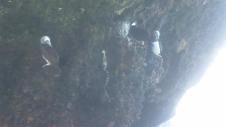 A few of the guides from our trip climbed up the rocky side of the island wall to try to get closer and the adult birds took on a defensive stance.