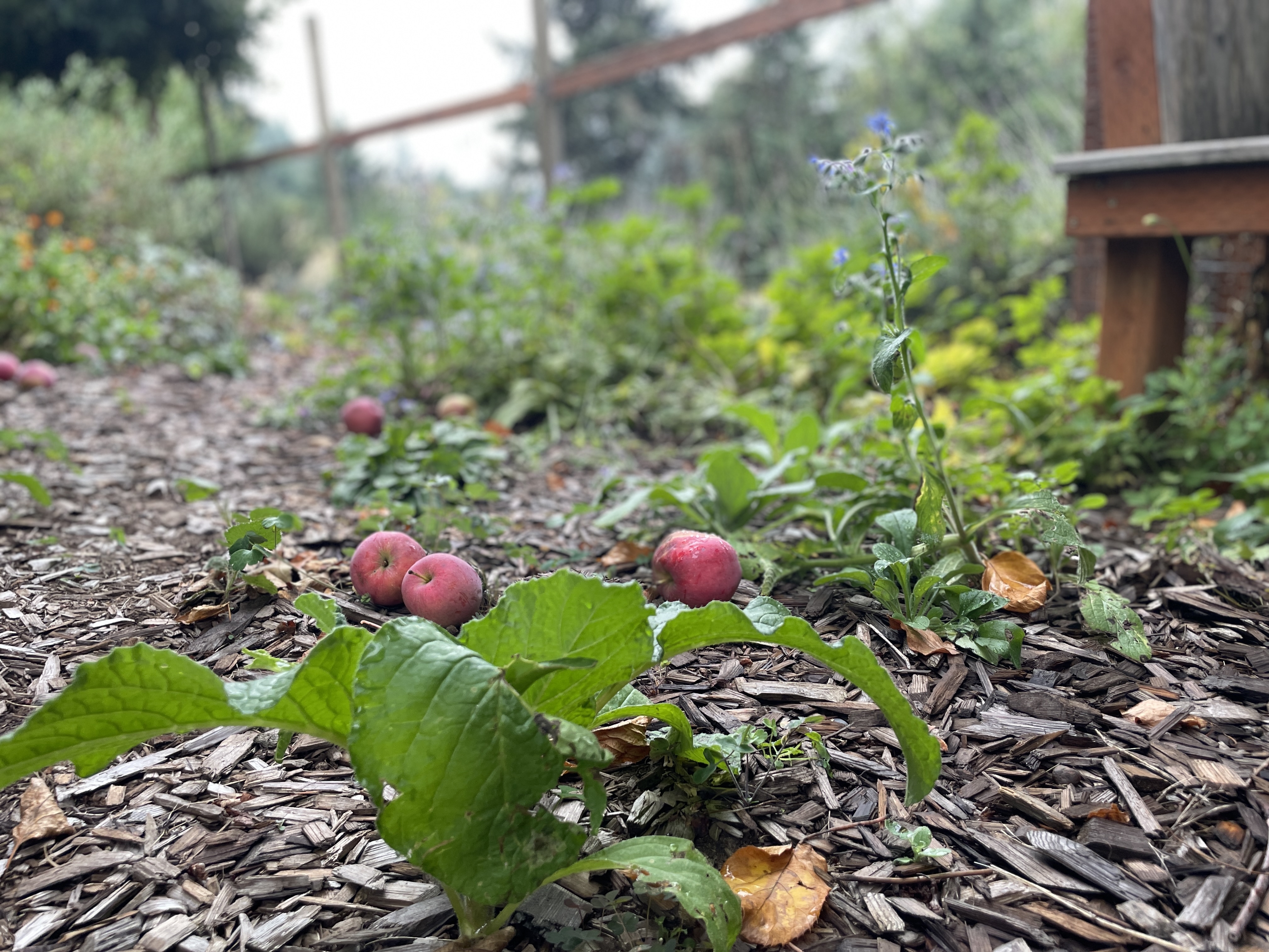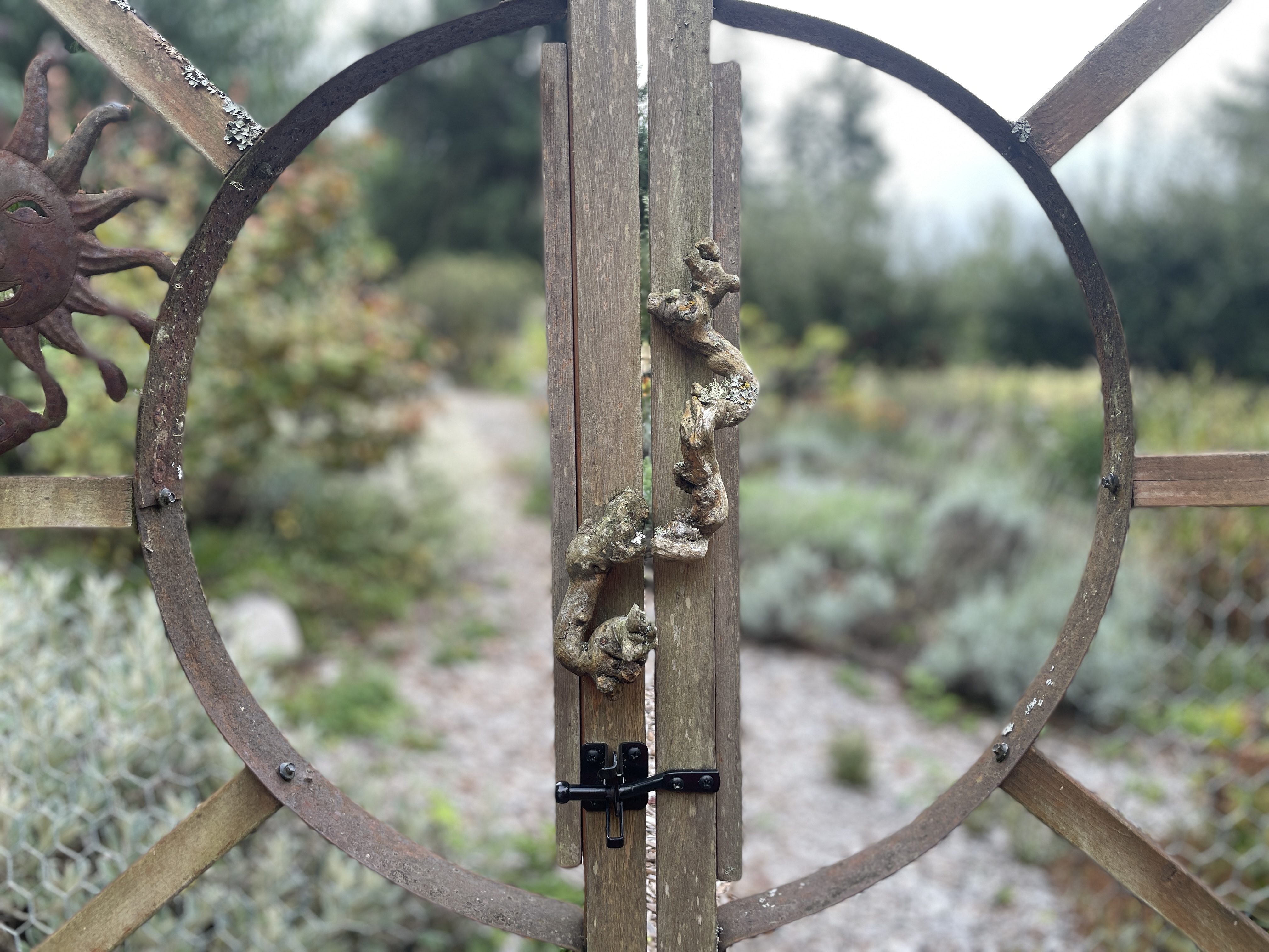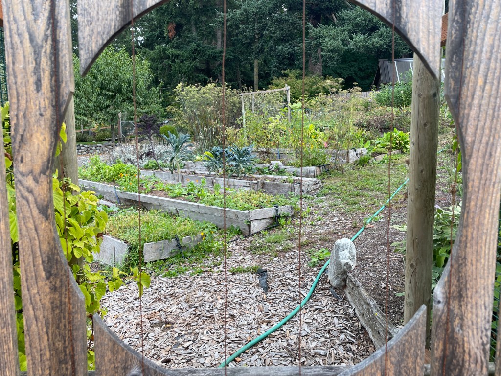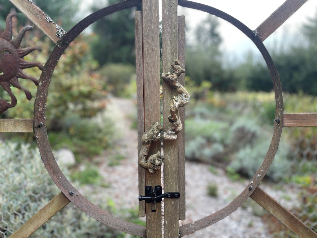 There was a beautiful garden next to the cabins where we stayed, which is where I started my walk on that second day. The gates were decorated with artwork resembling a sun and the outside of the garden was bordered by lavender plants. Inside, there were flowers, vegetables including kale and chard, sage and rosemary plants, apple trees and more.